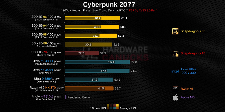 В Cyberpunk 2077 новое ядро Qualcomm отстаёт от лидера в лице Arc B390, но не катастрофически. При этом новинка быстрее Radeon 890M.